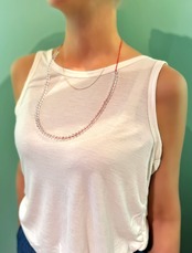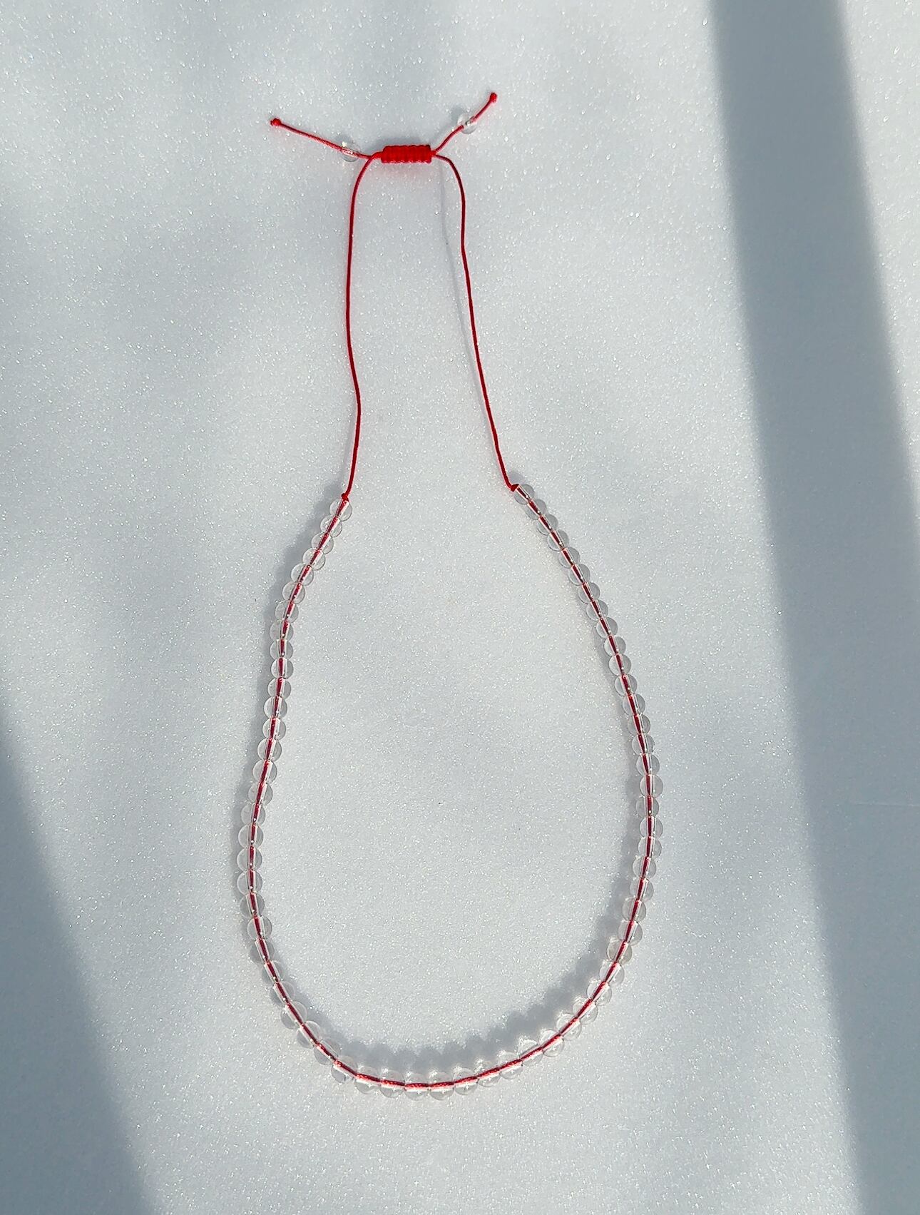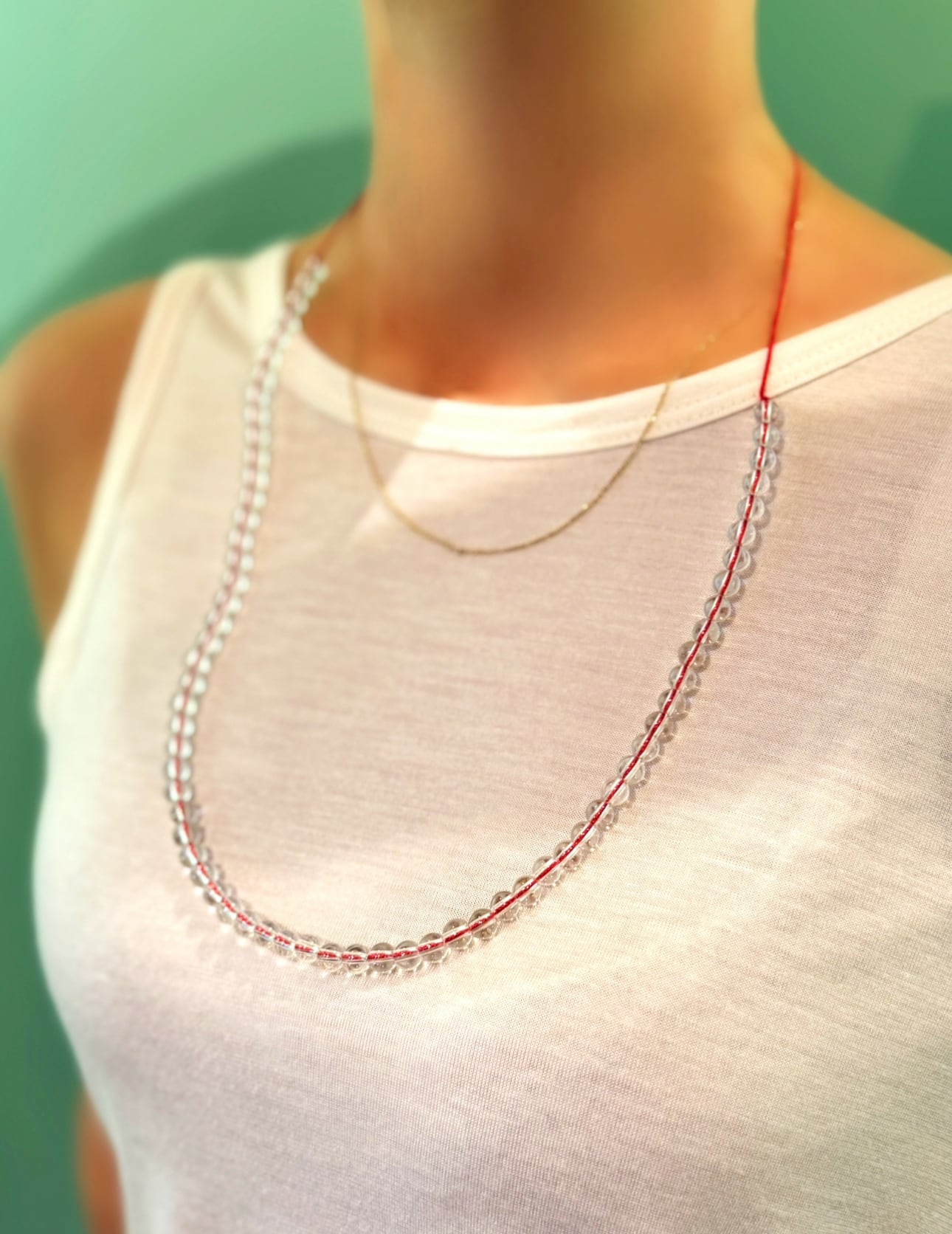 美しいクリアクォーツビーズのプルネックレスは、自然の輝き。地球の生命を感じファッションとして自身を輝かせてくれます。どんな洋服にも合わせやすいクリアークォーツ。6mmの透明感のあるクォーツストーンビーズが、目を引く赤いコードに連なっています。