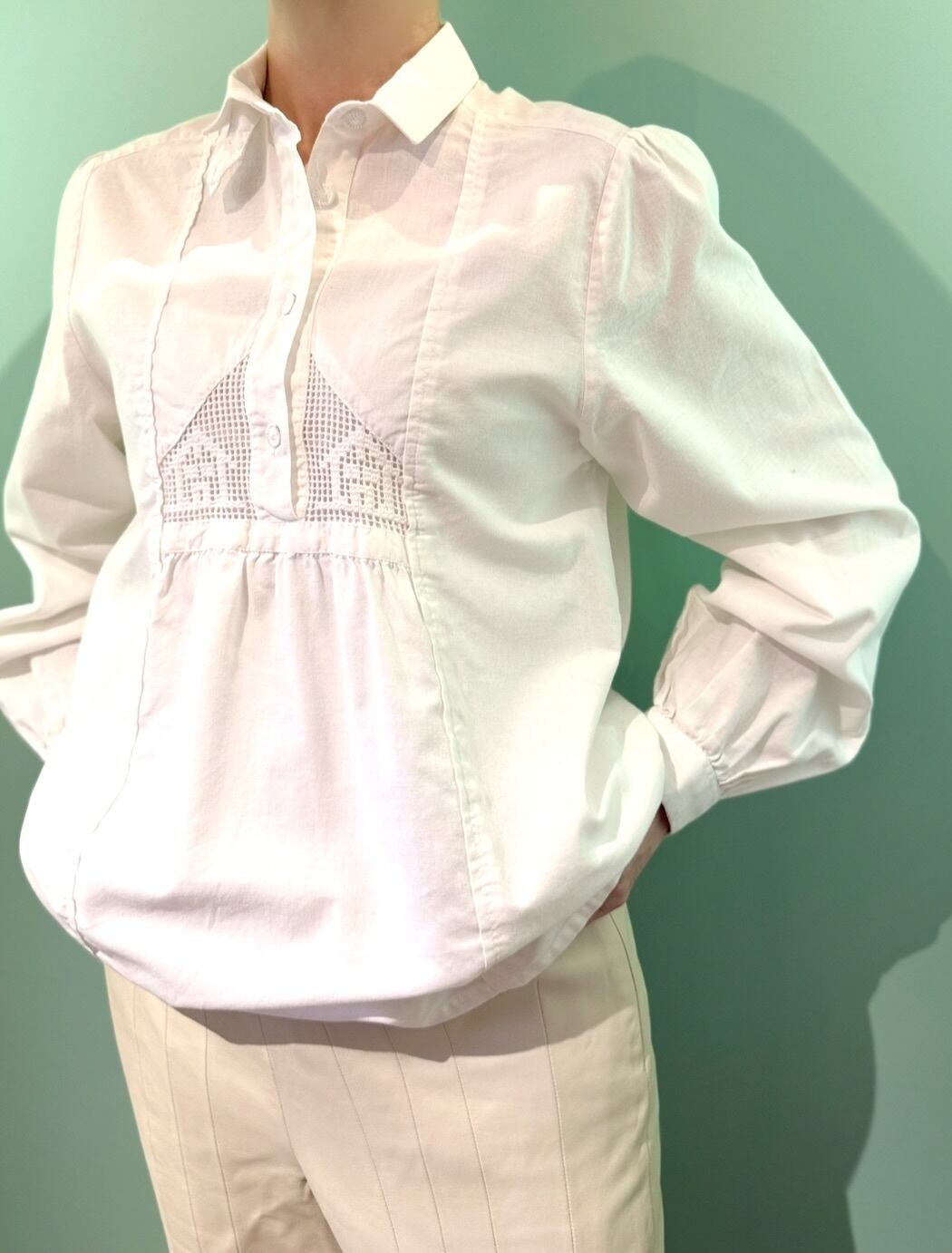 Austriaシャツはシンプルながら家モチーフが目立つホワイト。ジャブジャブ洗えるコットン。