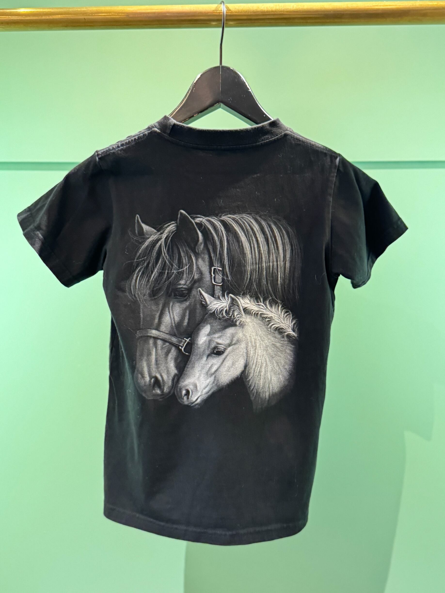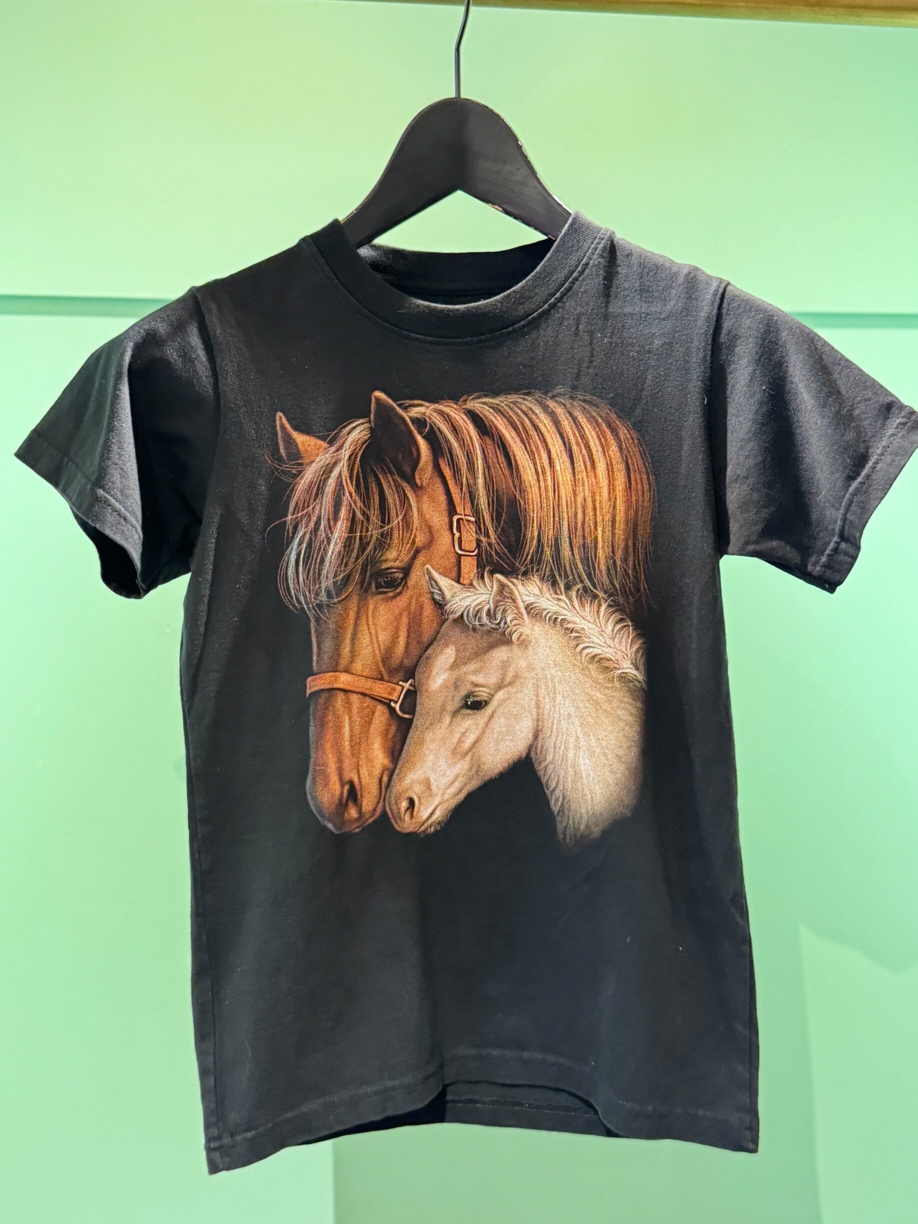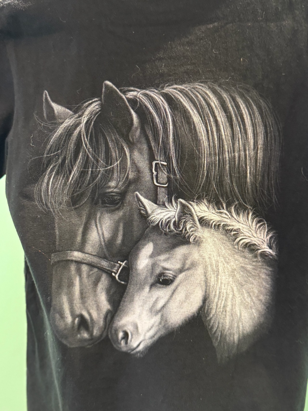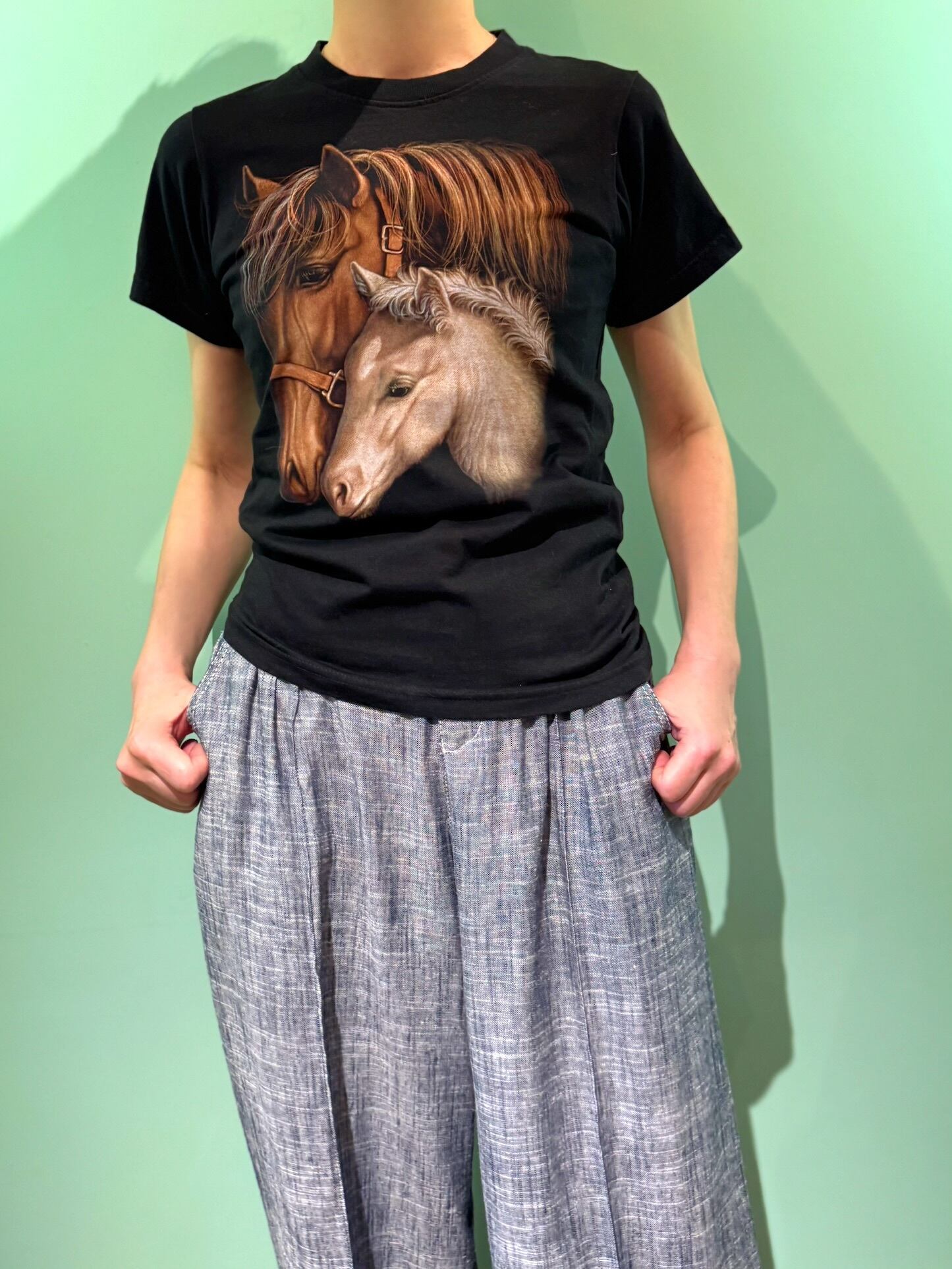 Vintage Tシャツ。絵画プリントのダナミックなTシャツです。小さめTシャツと太めパンツのスタイリング、オススメです。丈をまくって長さを変えると印象がかわります。チラリとお腹だし。夏が楽しみになります。