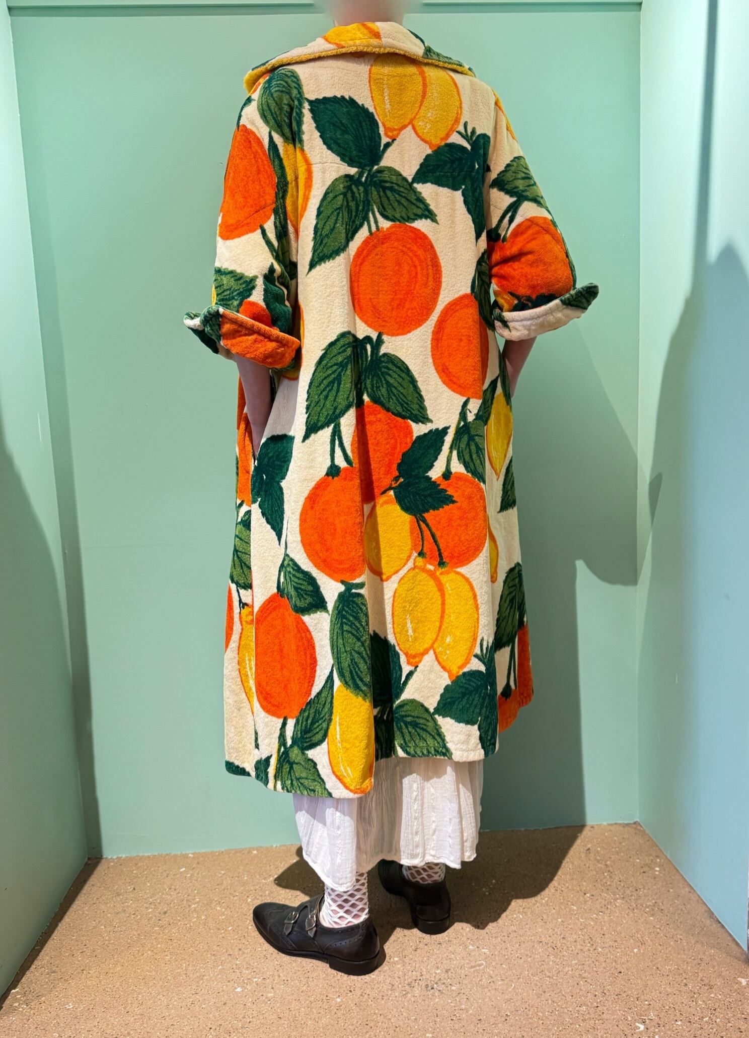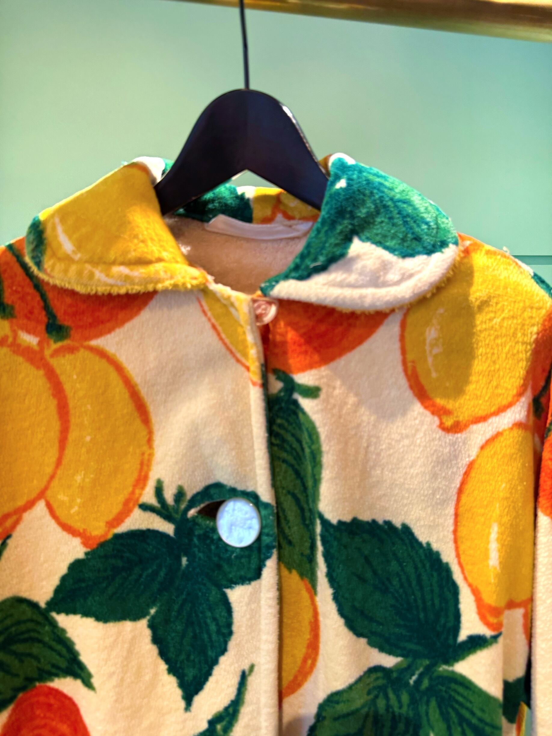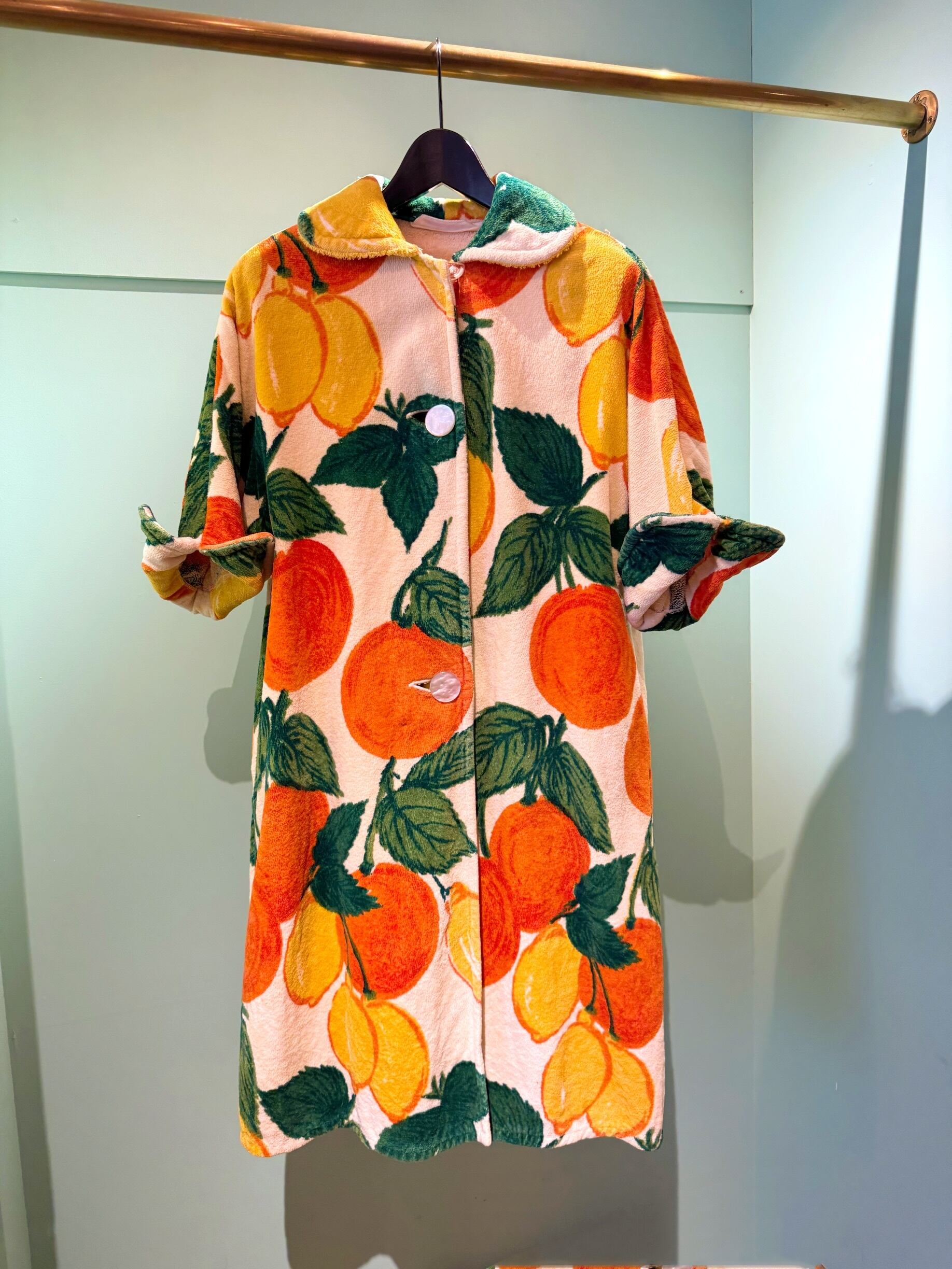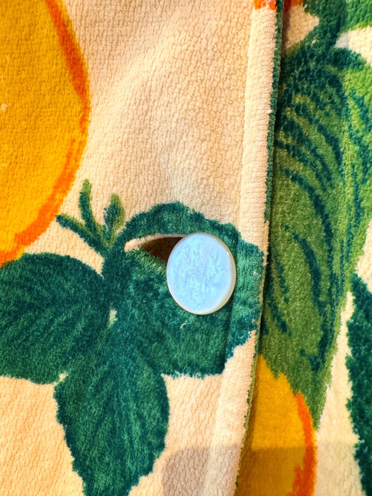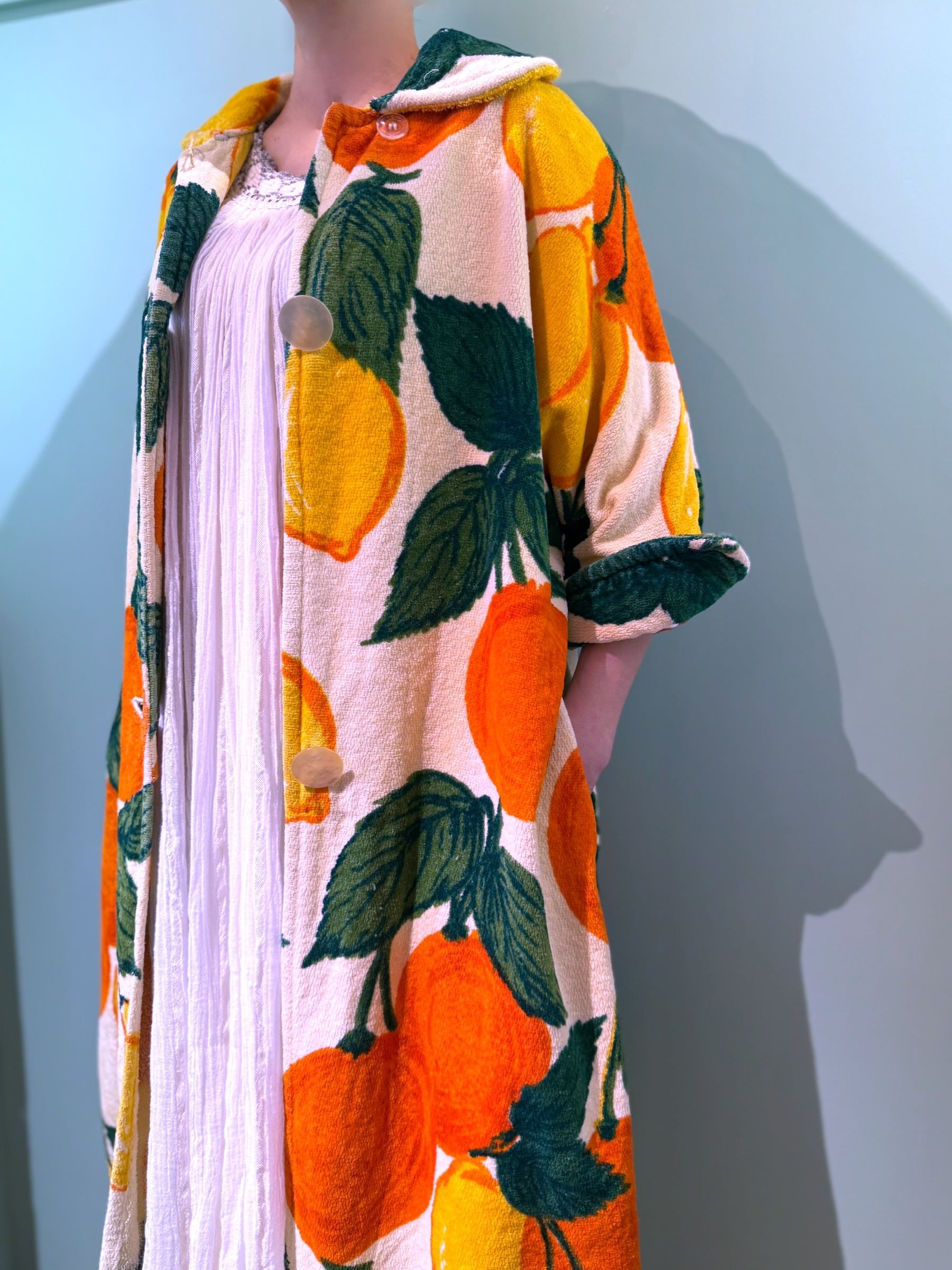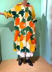 大胆なフルーツに釘付けになります。 大きなボタン、ラウンドカラー、7部丈袖の軽さ、50年代のディティールがステキです。