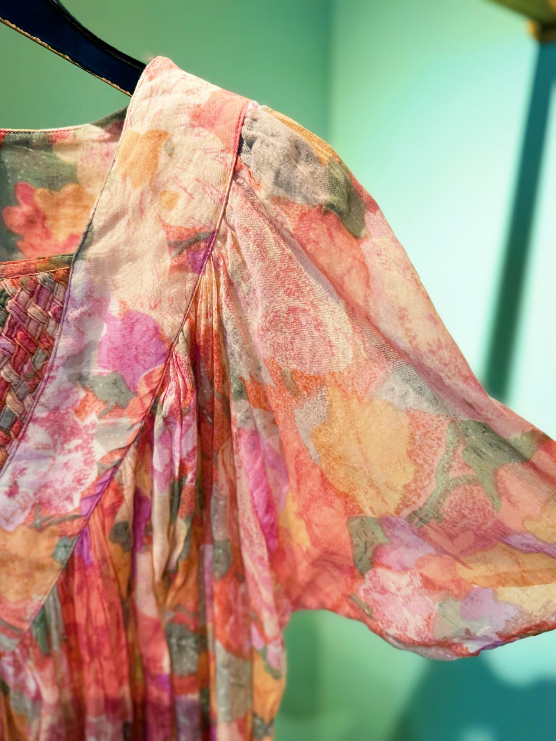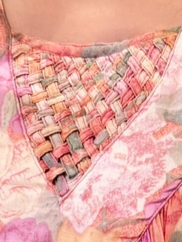 胸元の編み込みディテールと軽やかなフレアシルエットが印象的です。