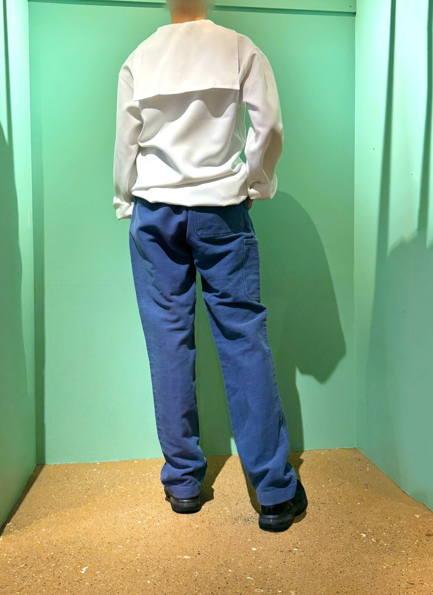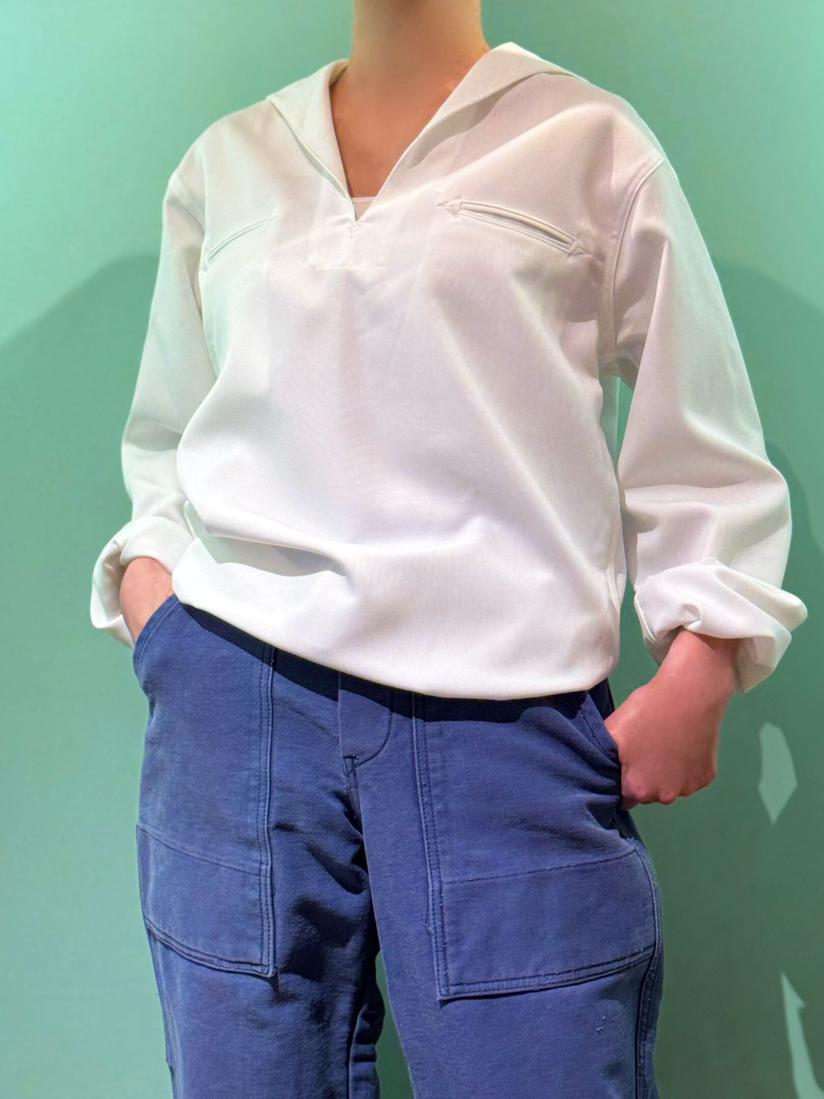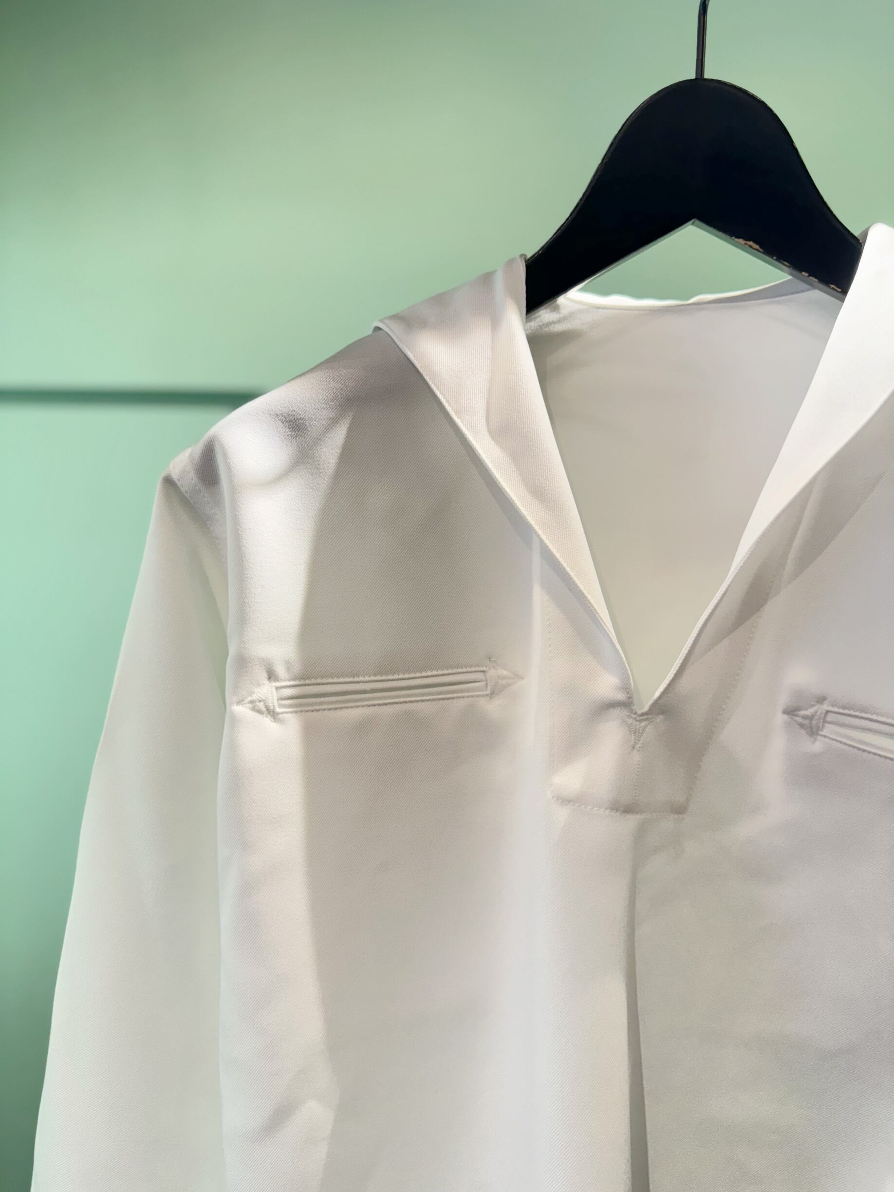 クリーンで端正な白、無駄のない直線的なカッティングが印象的。セーラーカラーの抜け感と、ややゆったりしたシルエットが、現代的なスタイリングにもマッチします。