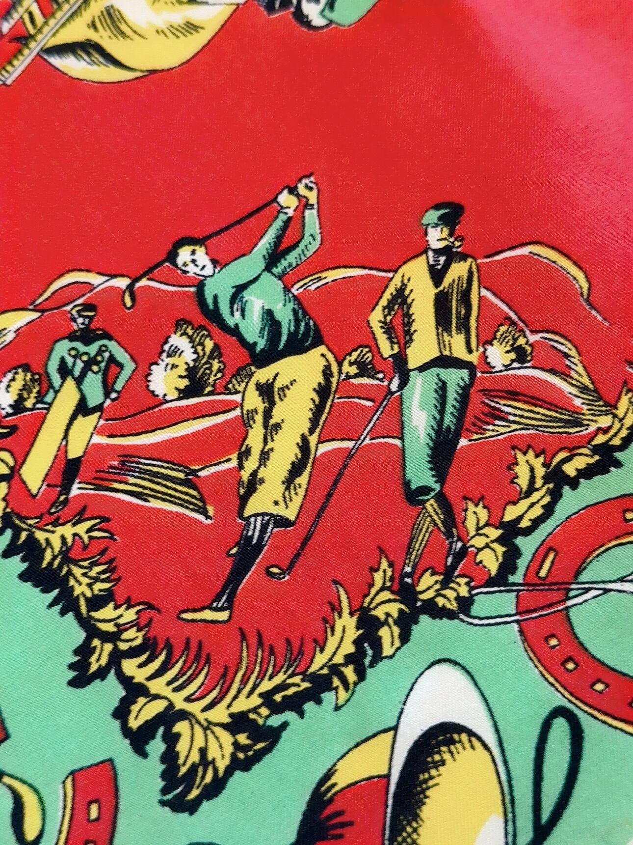 騎馬競技、ゴルフ、ピクニックなどがコミカルかつエレガントに表現され、ホースシューやラッパ、テンガロンハットなどの縁飾りがさらに遊び心を添えています。