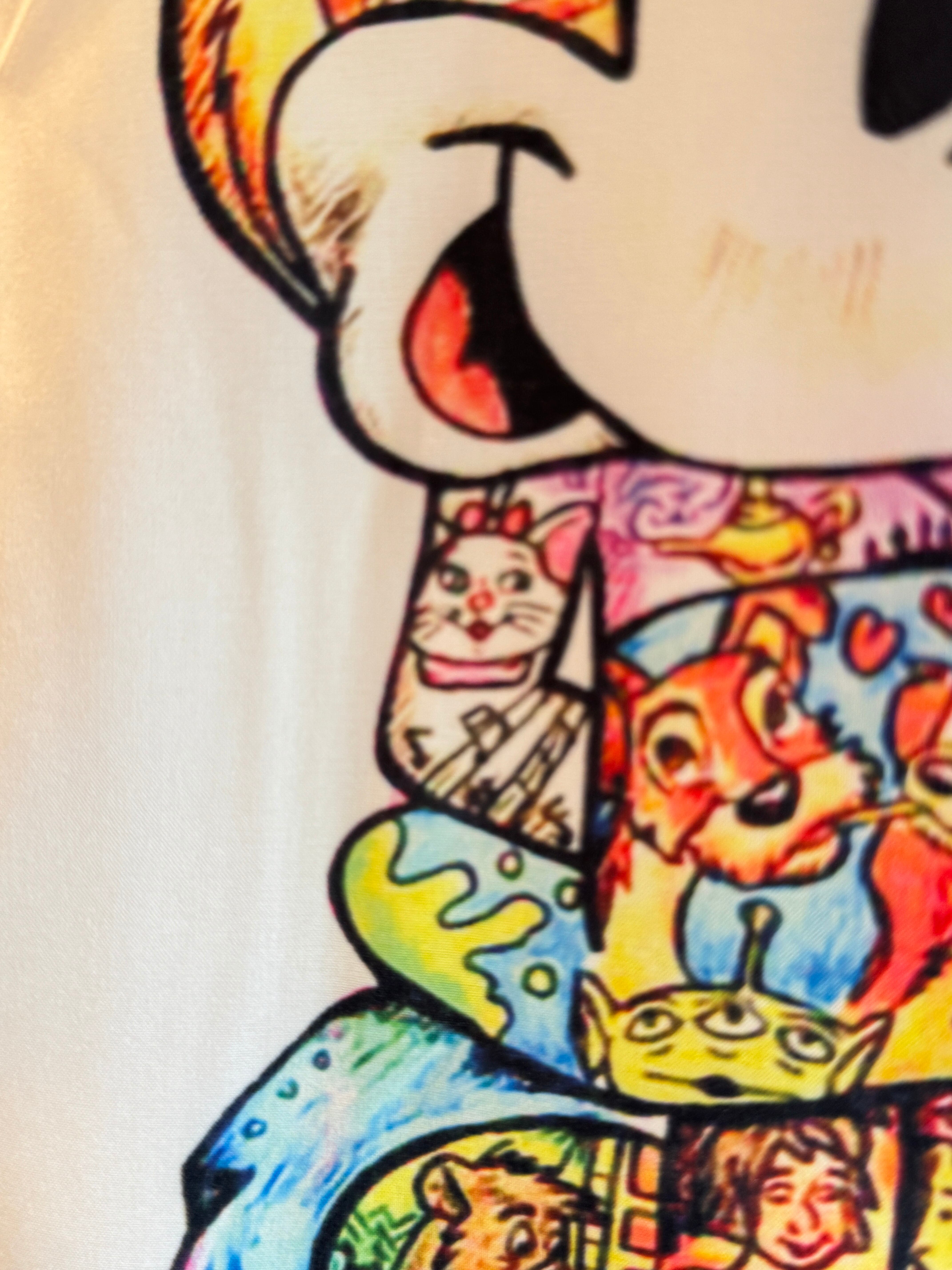 ミッキーとミニーのシルエットの中に、ディズニーを代表する人気キャラクターたちがぎっしりコラージュされた、まるでアートのようなデザイン。