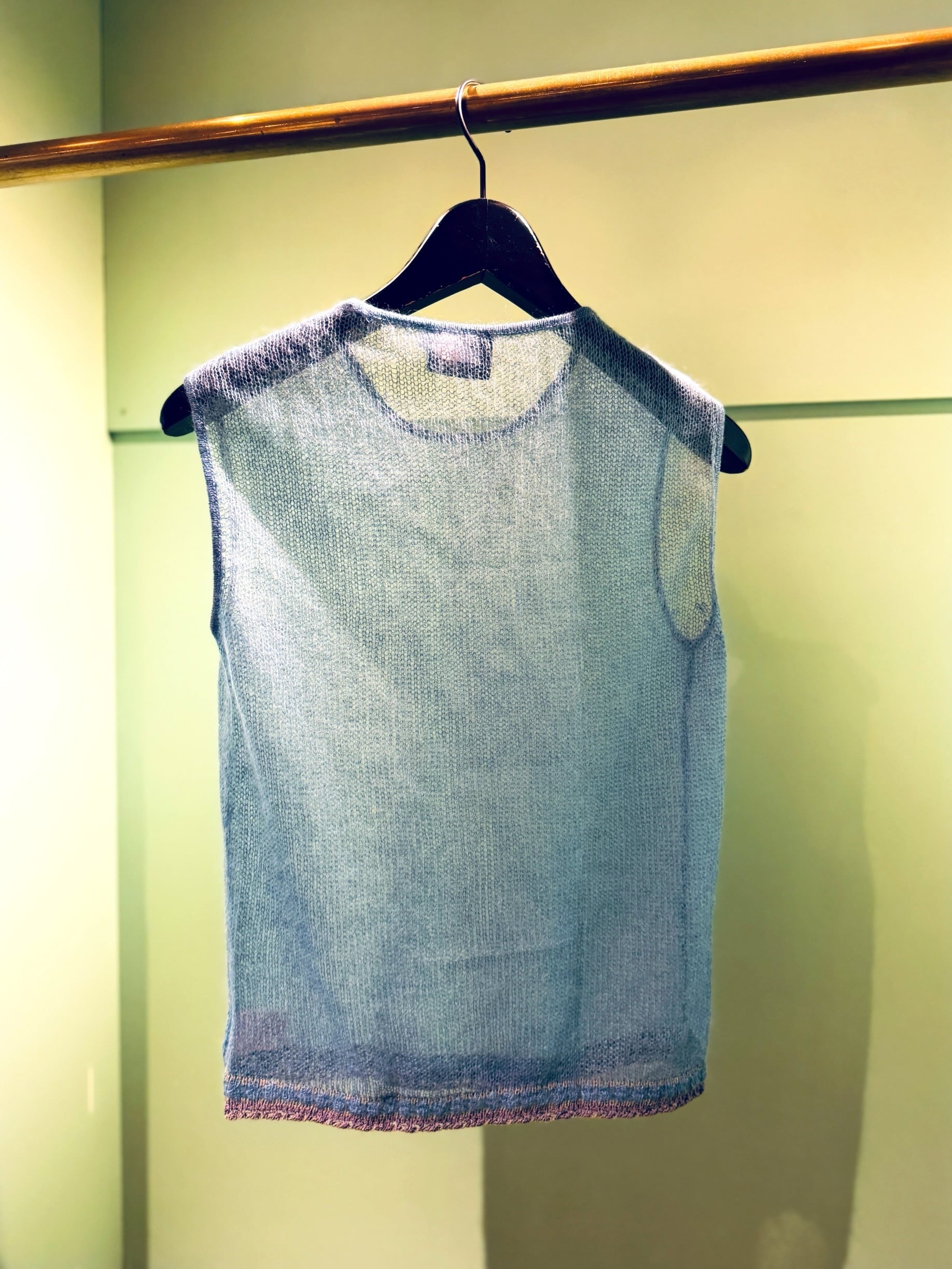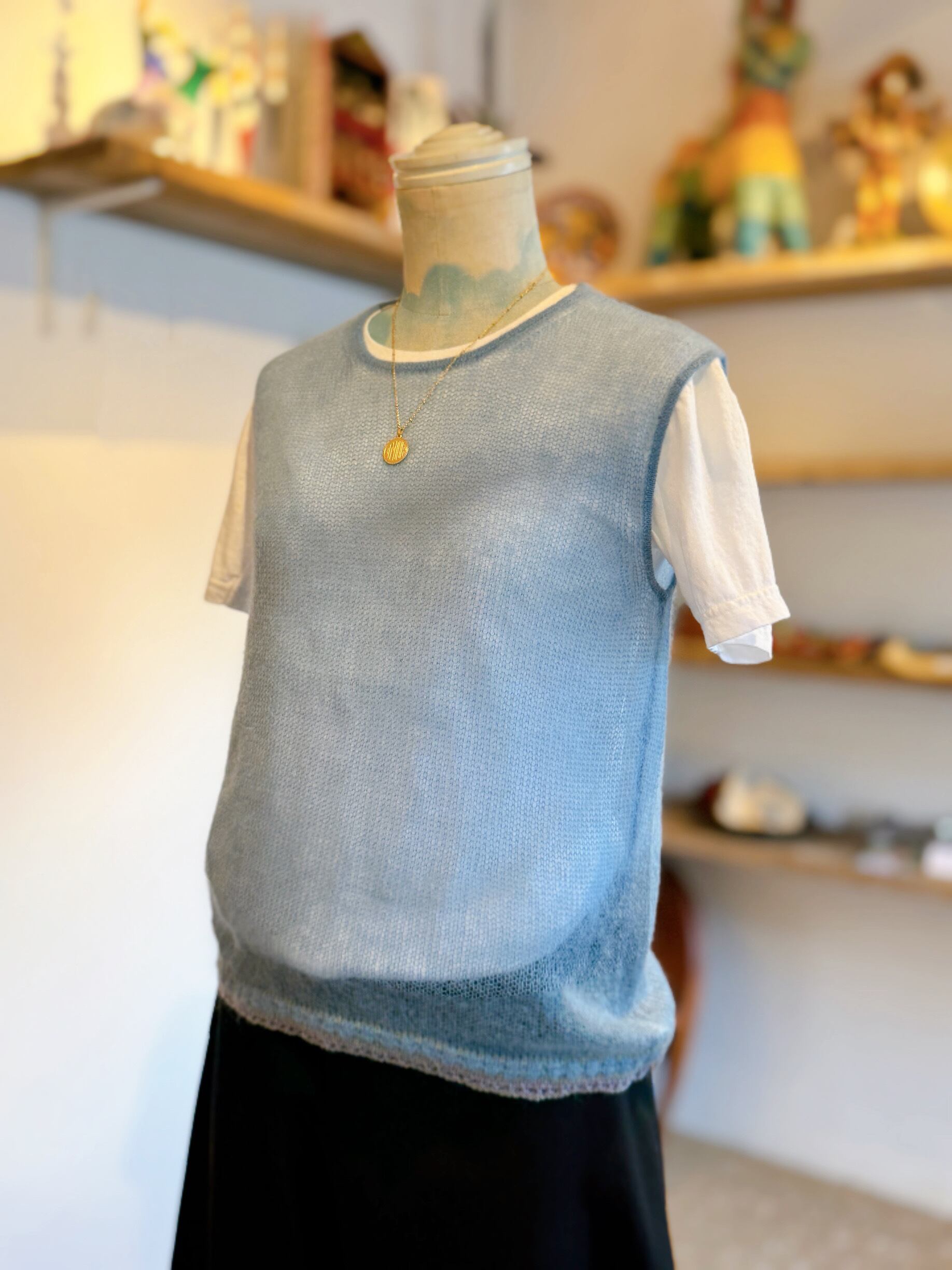 淡いブルーの透け感ある編み地は、軽やかさと品を同時に表現。