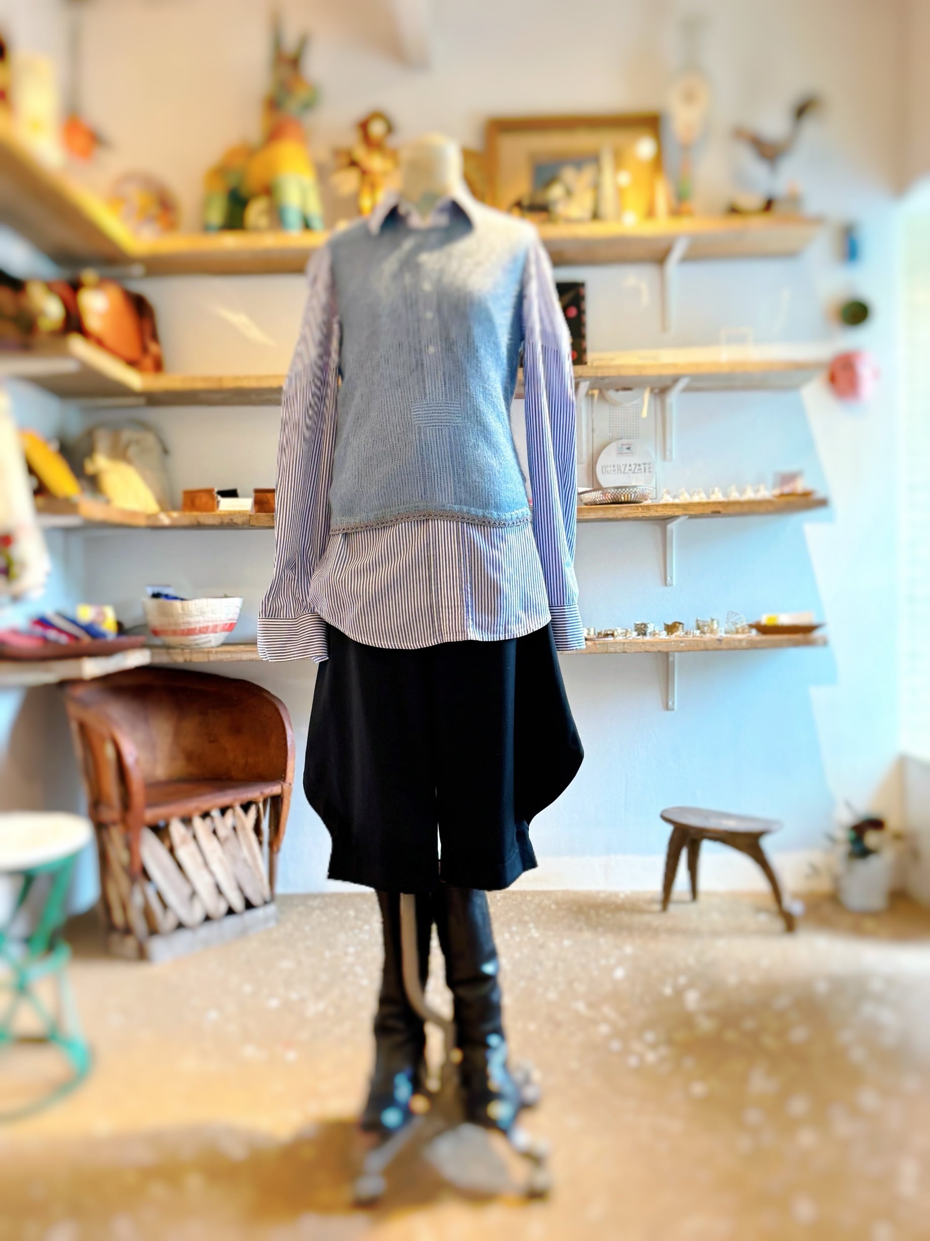 そして見逃せないのは、袖ぐりやネックラインの美しい端処理。繊細なリブ仕立てが、シンプルなシルエットに格別の完成度を与えています。