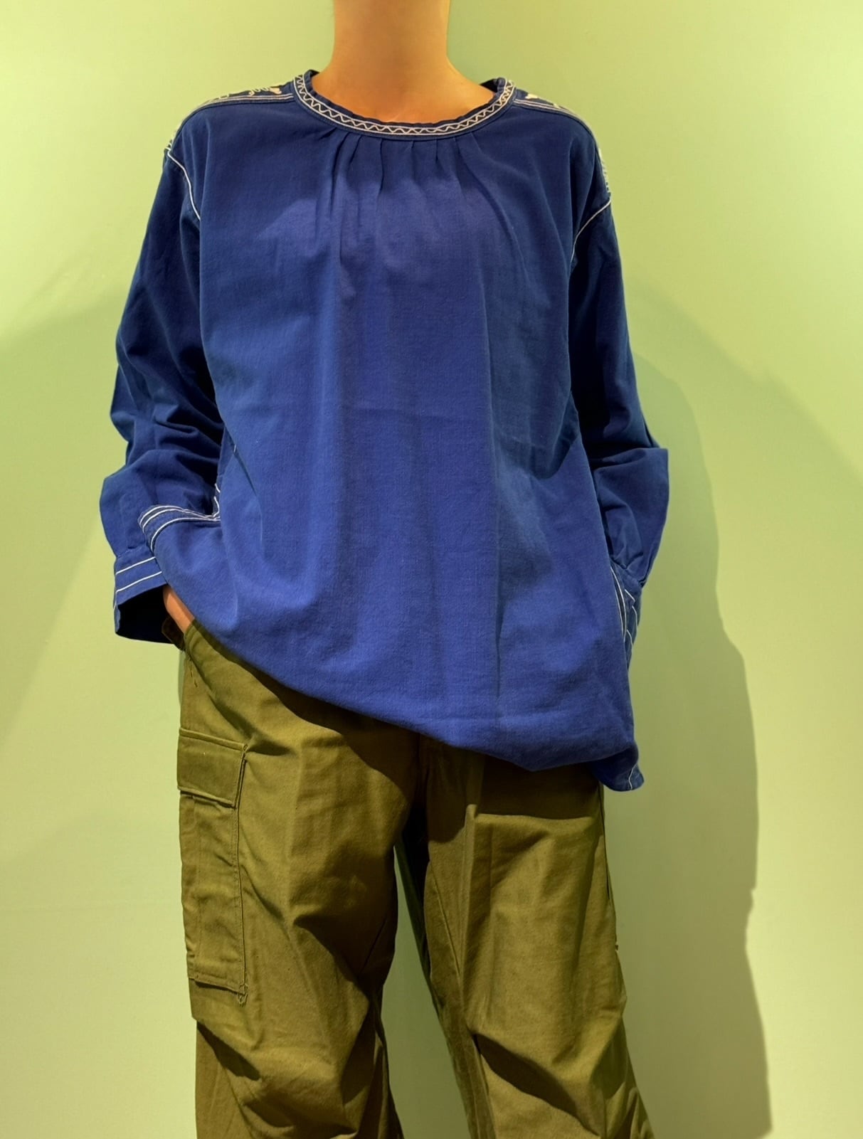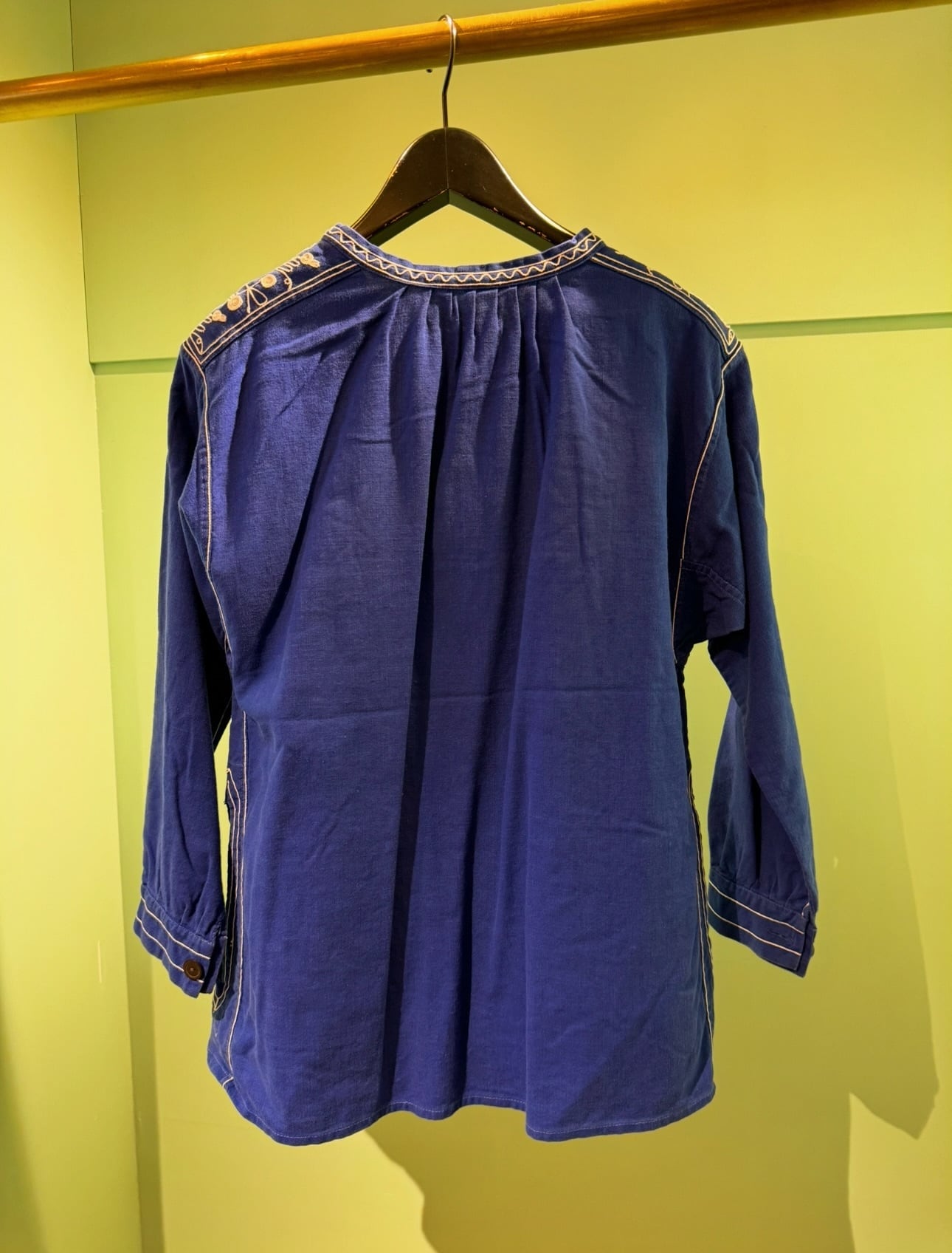 藍色ブルーのコットン地に生成りの刺繍が映える一着です。