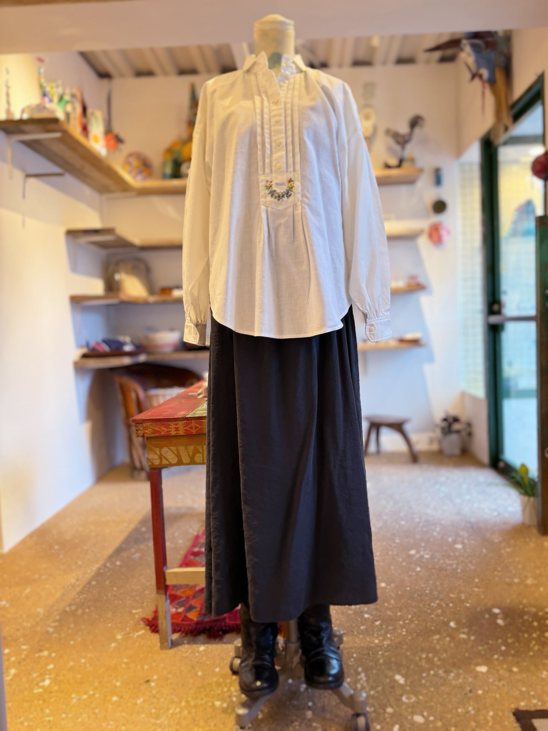 秋の光をすっと受けとめる、柔らかなプルオーバーシャツです。