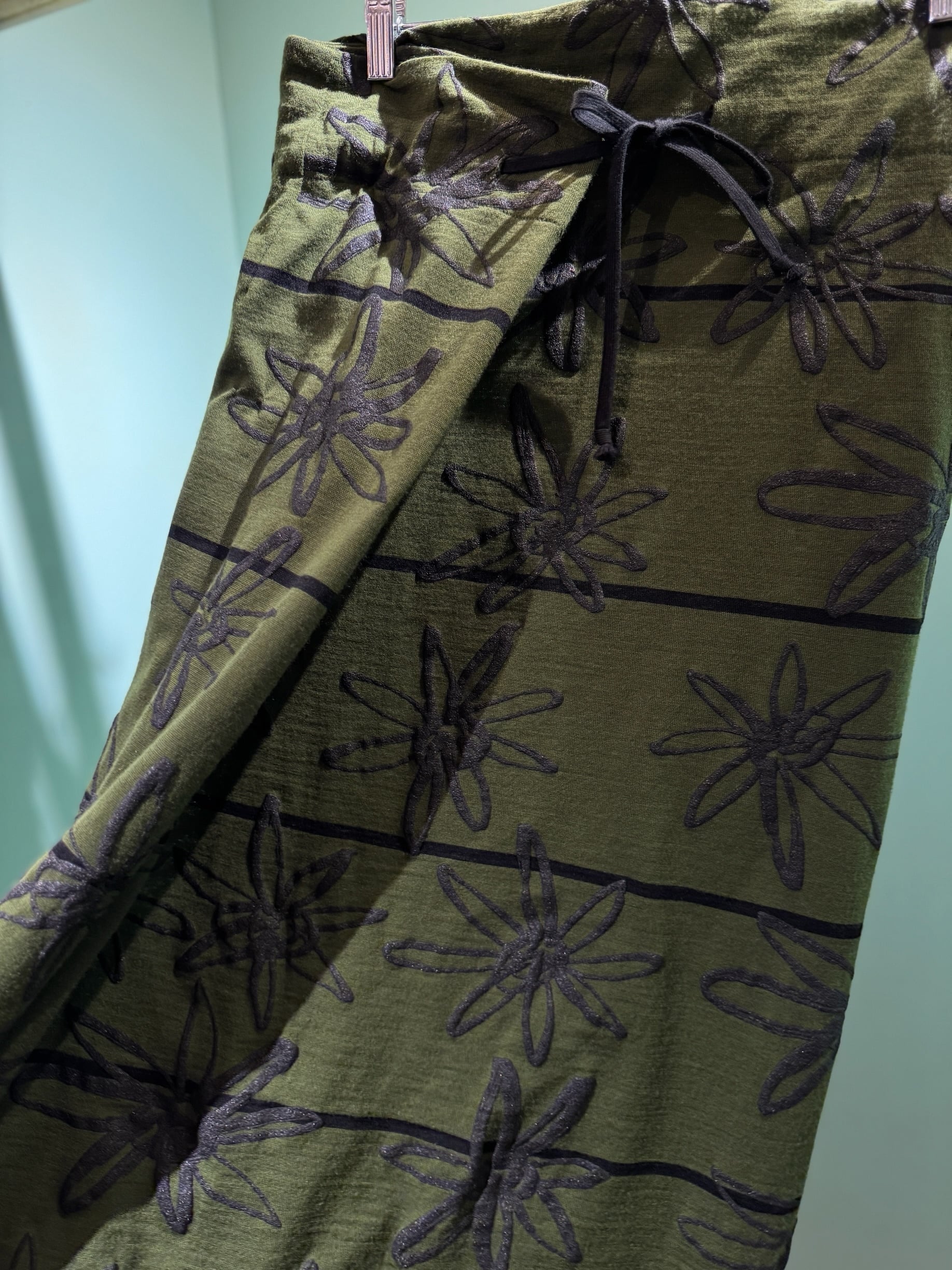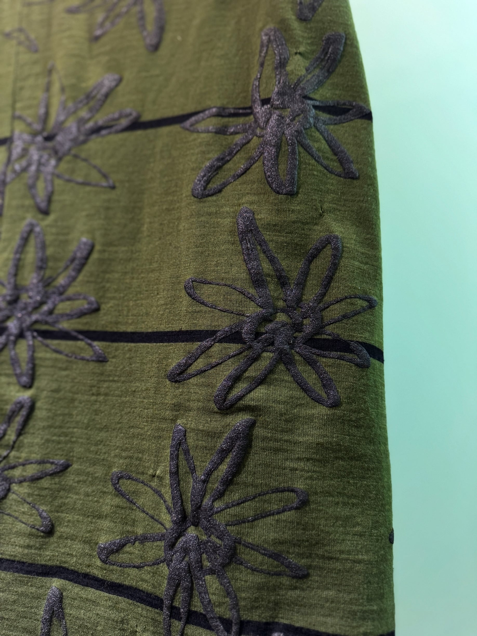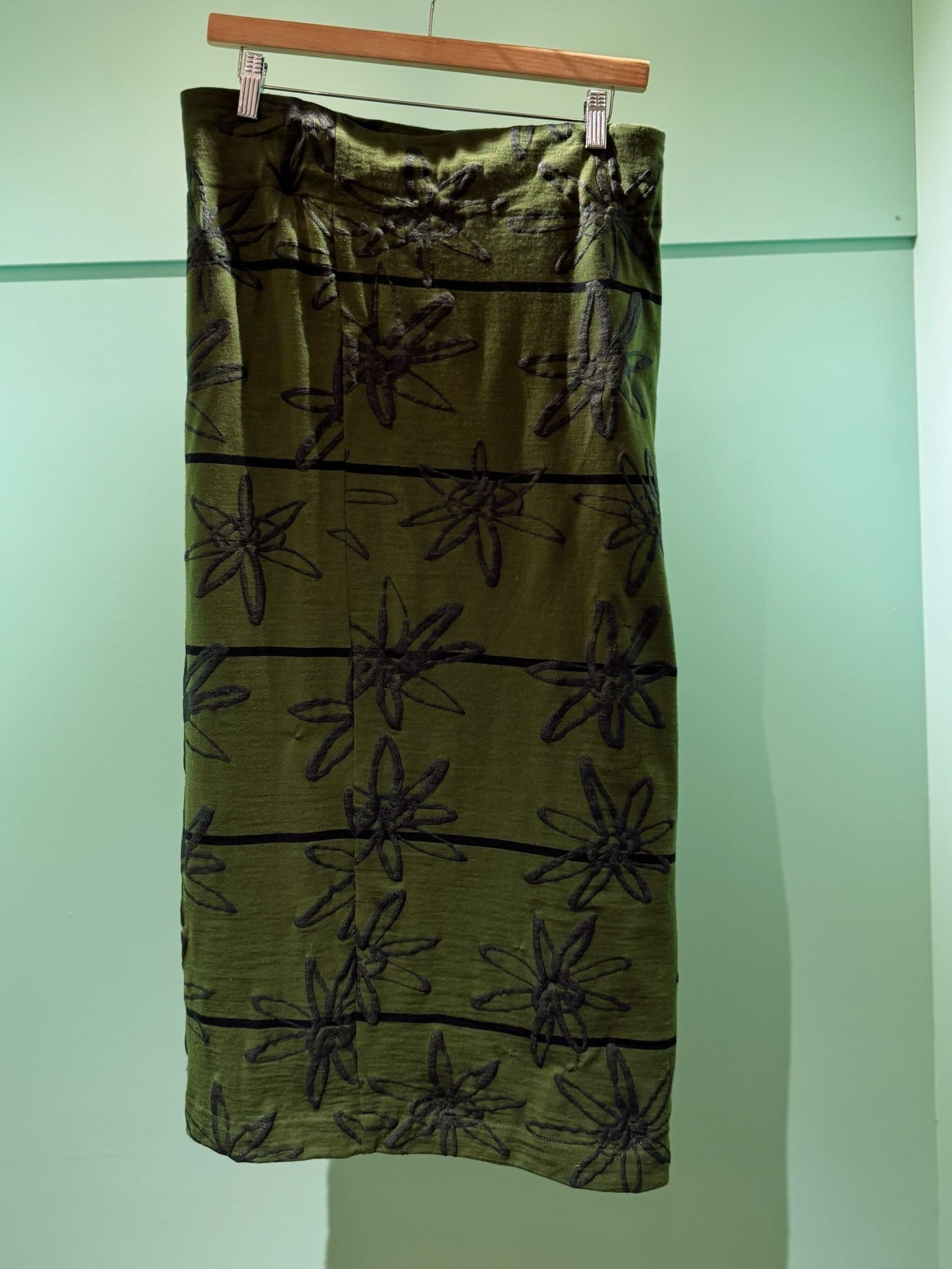オリーブグリーンのウール地に抽象的な花モチーフをのせた、まるで「布を彫刻するような」デザインのスカートです。