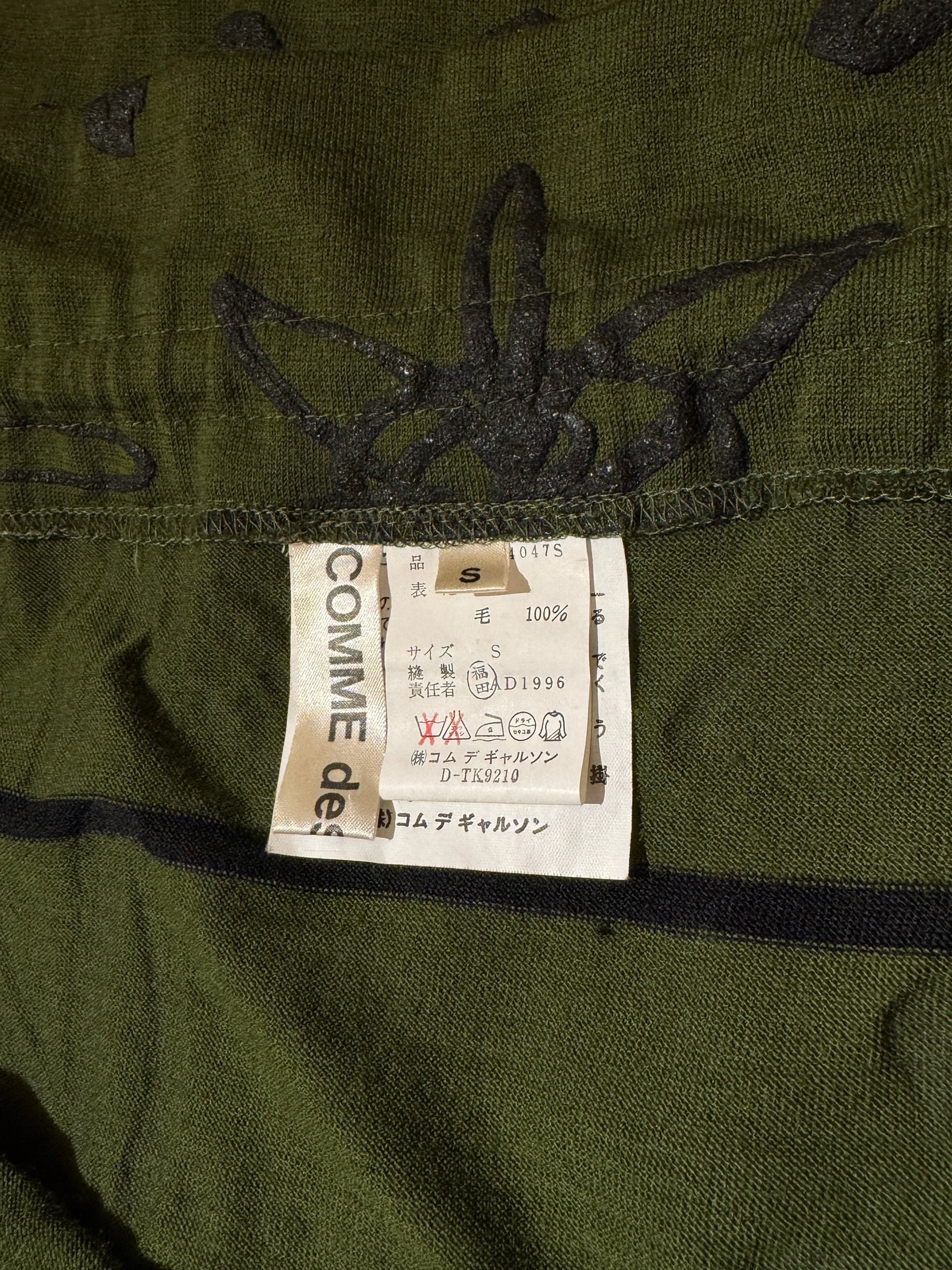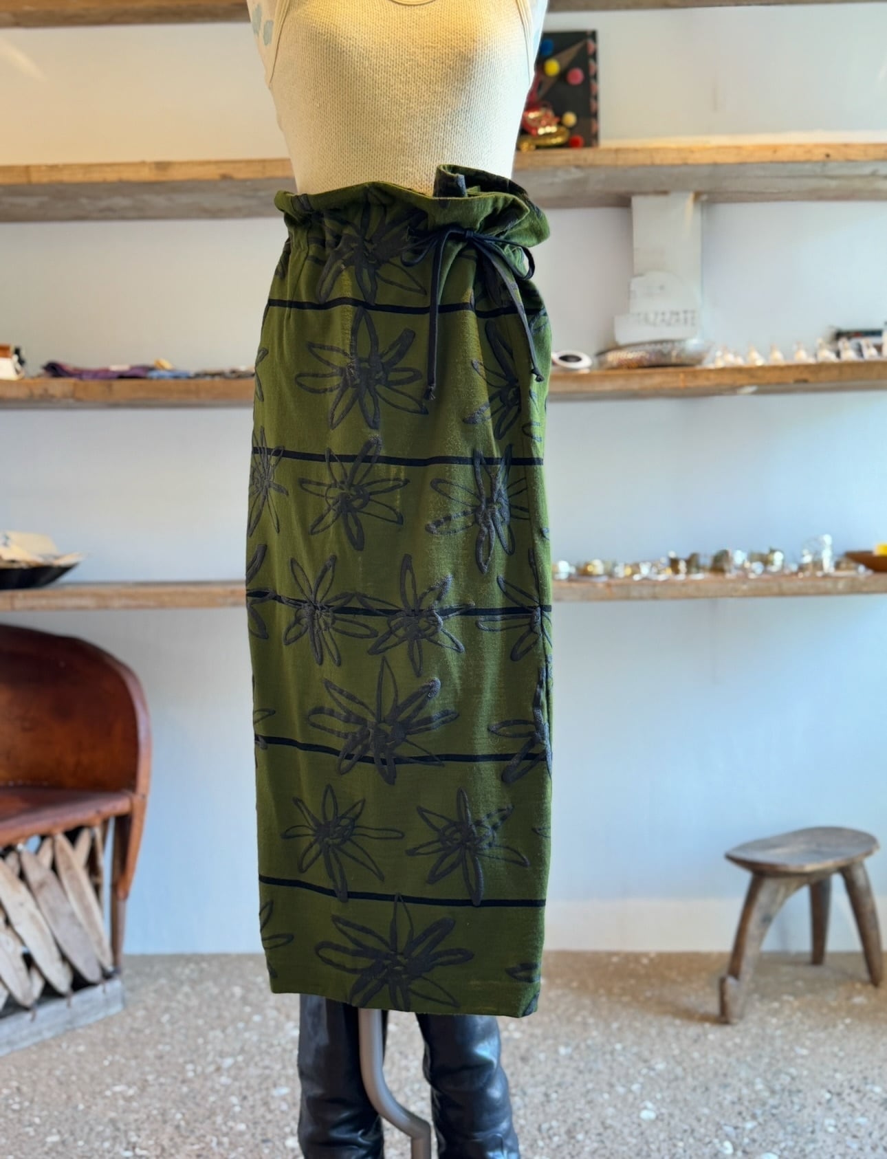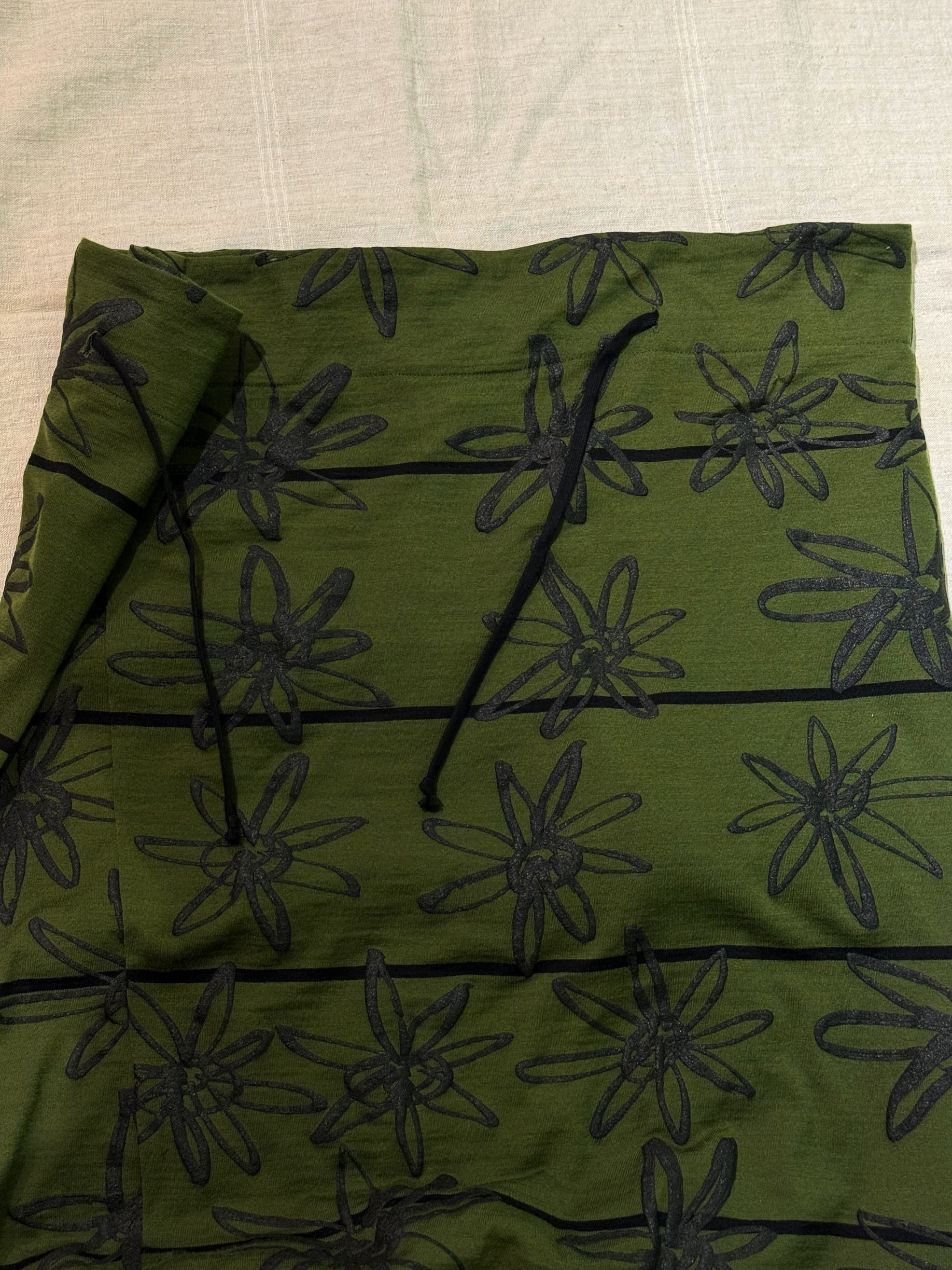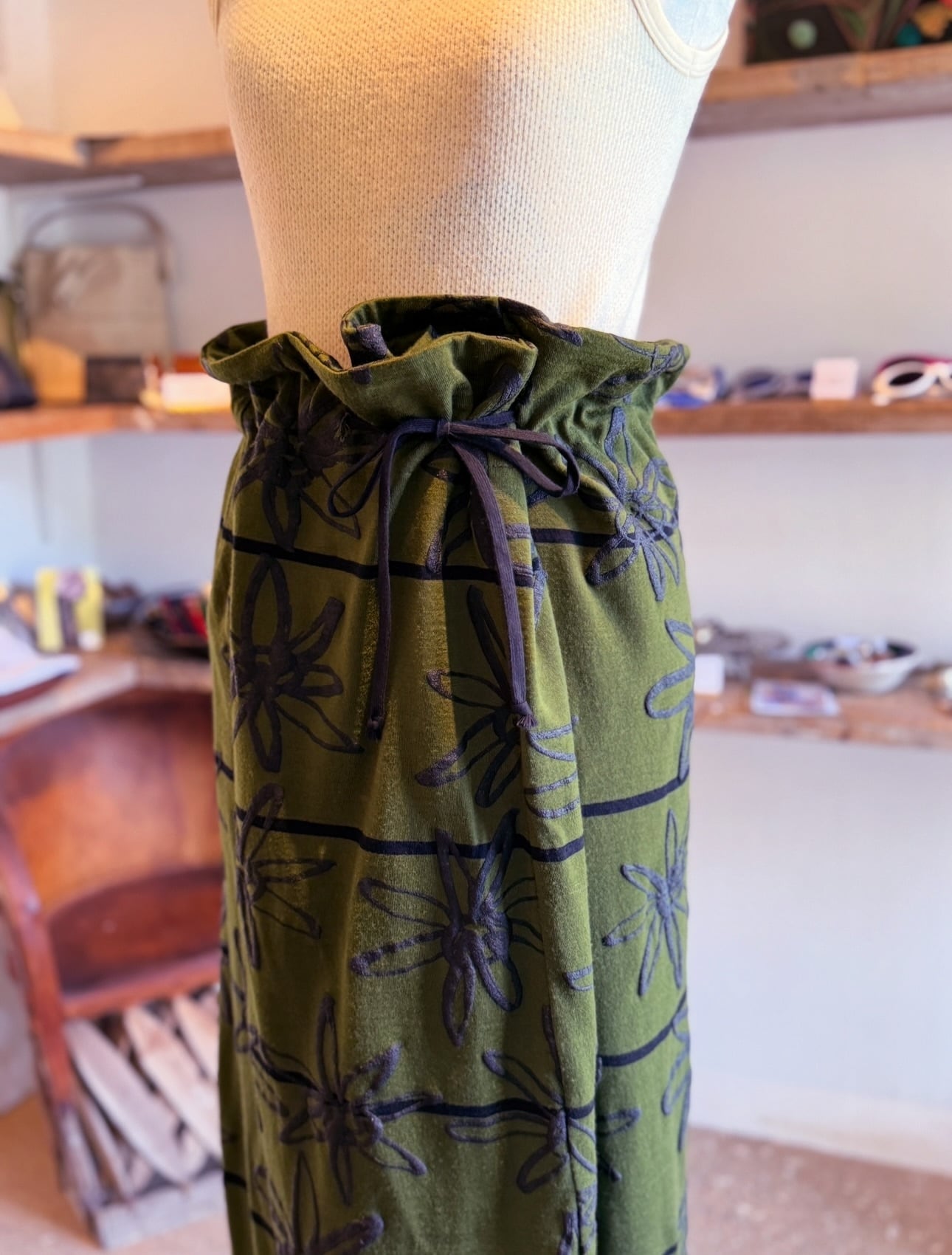 オリーブグリーンのウール地に抽象的な花モチーフをのせた、まるで「布を彫刻するような」デザインのスカートです。